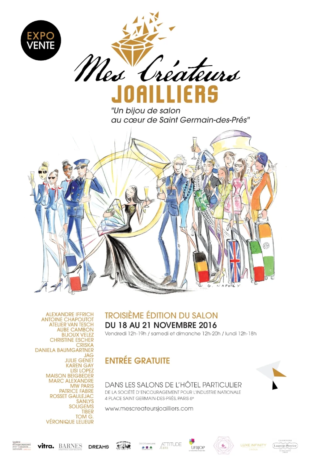 "Mes Créateurs Joailliers" ("My Jewelry Designers") is a fair and exhibition open to everyone. It gathers contemporary jewelry craftsmen from diverse and personal universes. opening hours Friday November 18 : Noon-7pm Saturday November 19 and Sunday November 20 : Noon-8pm Monday November 21 : Noon-6pm http://www.mescreateursjoailliers.com
